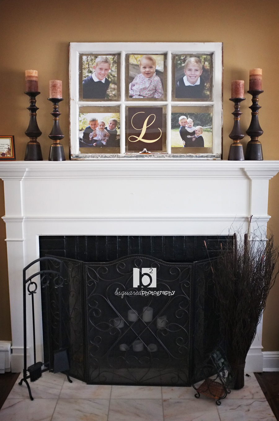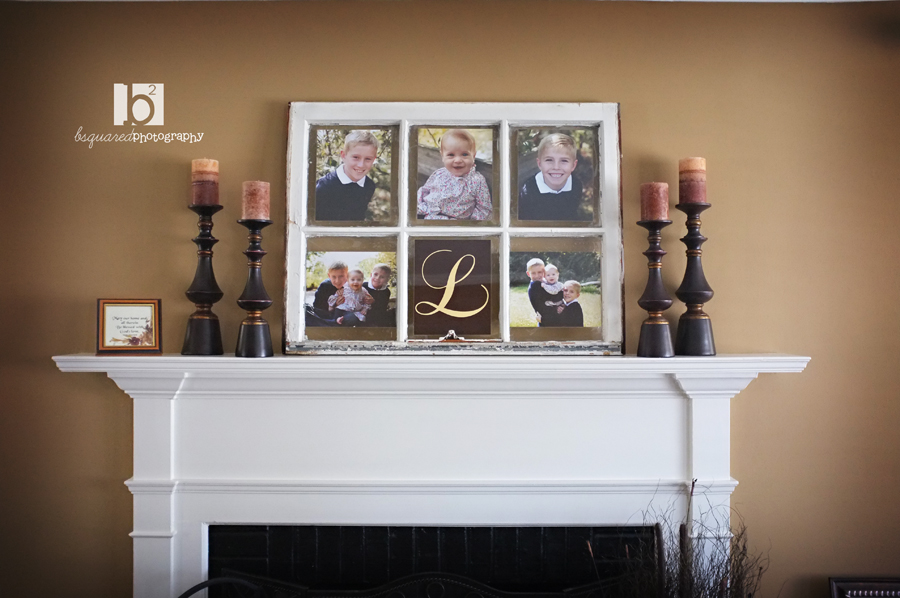 My favorite parts of hanging Kelly’s frames were 1. She made her painter crazy by choosing colors that matched the frames. and 2. Her oldest son came upstairs just as we were finishing up and was all smiles and compliments on the pictures and frames. He was so happy that his picture was displayed where everyone could see it!And we did a pretty window frame for Kelly’s living room. I love how the colors in the photos match her living room perfectly and the L monogram was the perfect addition (my first time doing a monogram in the frame- love that idea and hope to do it again!)