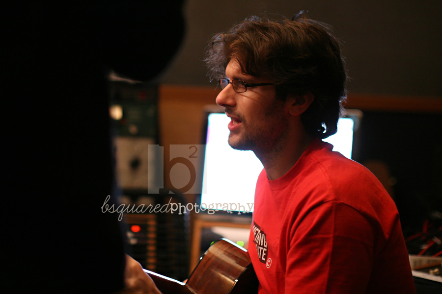Brian on vocals and guitar. In the funky red isolation booth. And we noticed that his shirt is the same shirt he wore at the last recording session I photographed during The December Sessions.