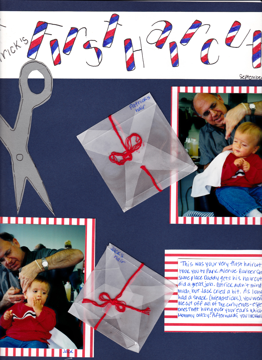 A bad scan of the boys first haircut scrapbook page. They were okay the first time, it was every.single.time after that there was hysterics.