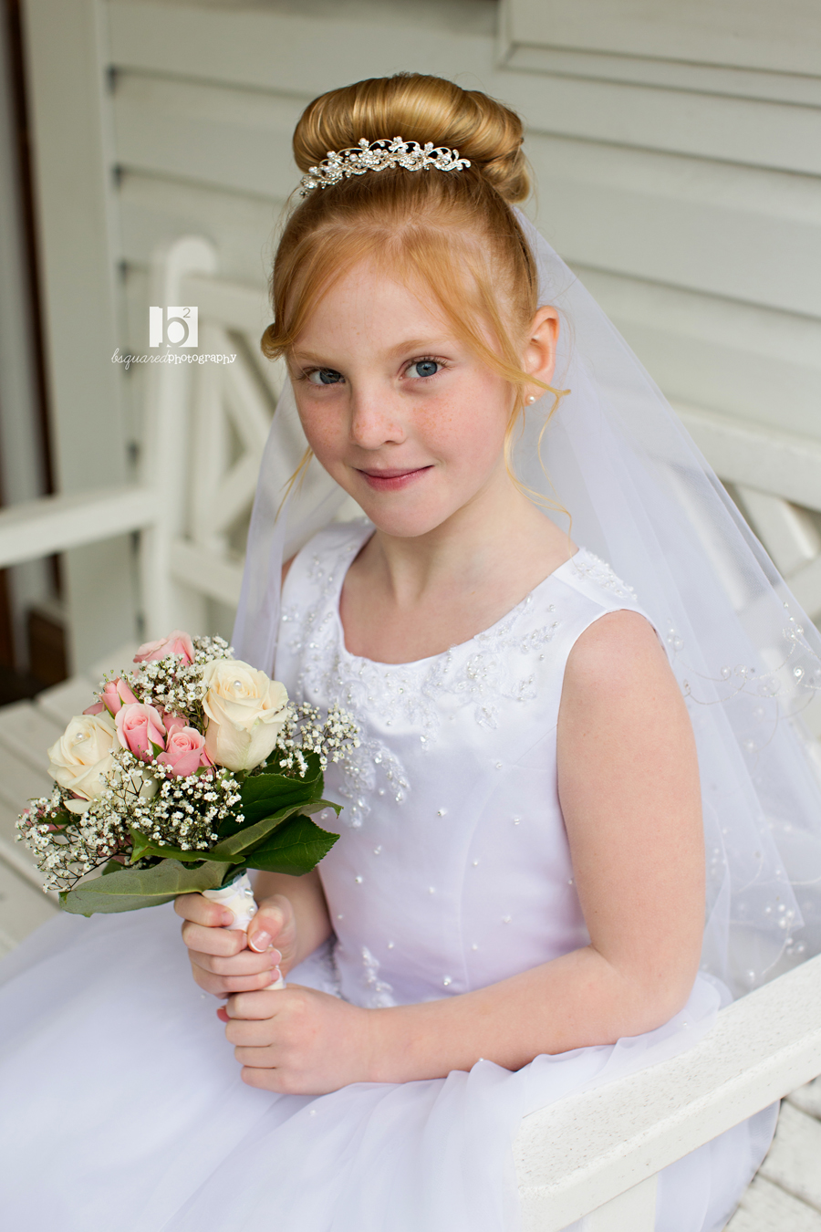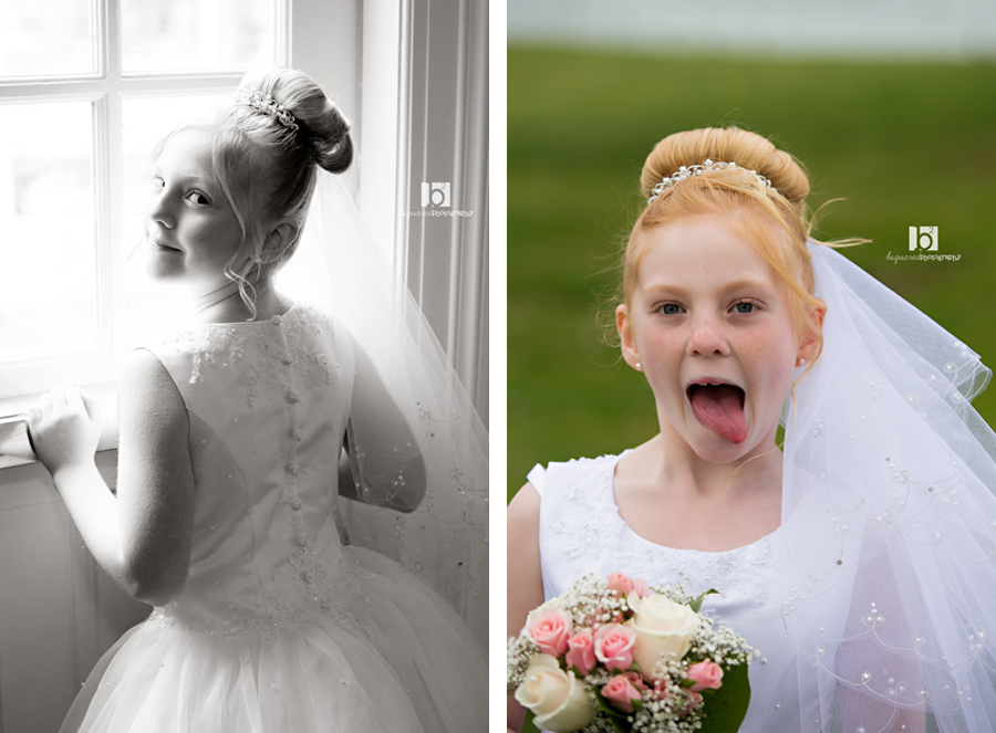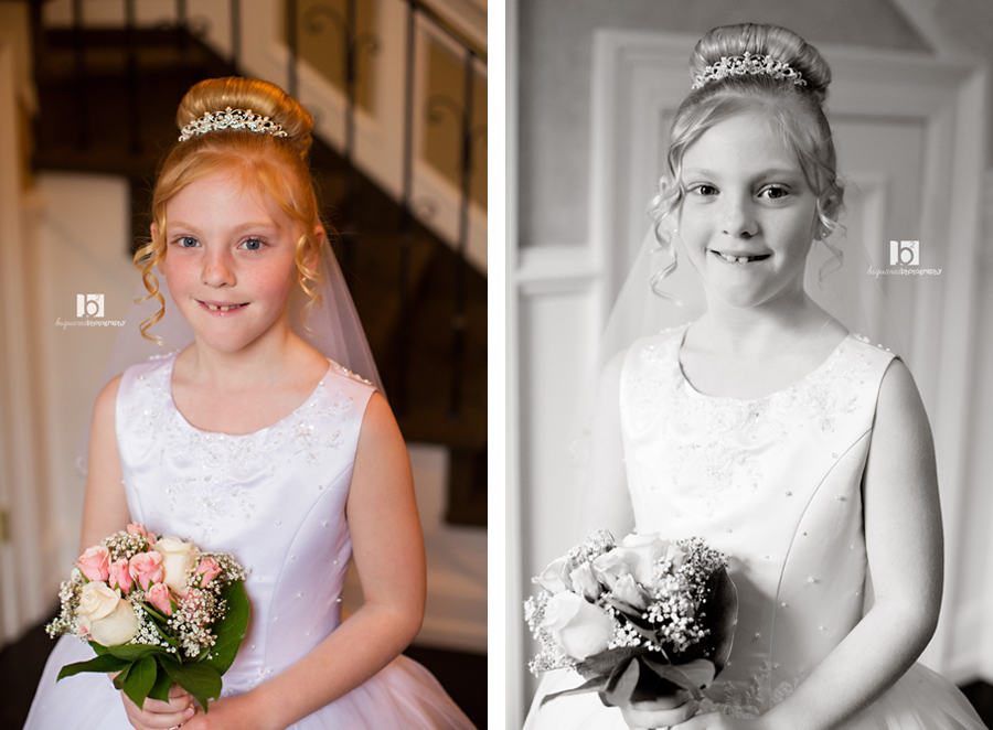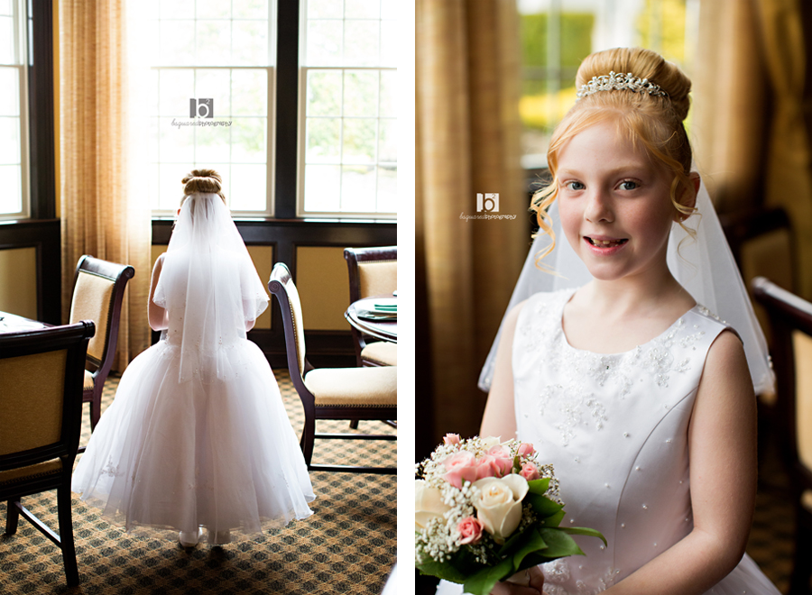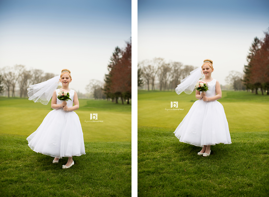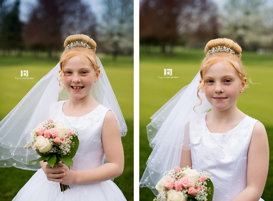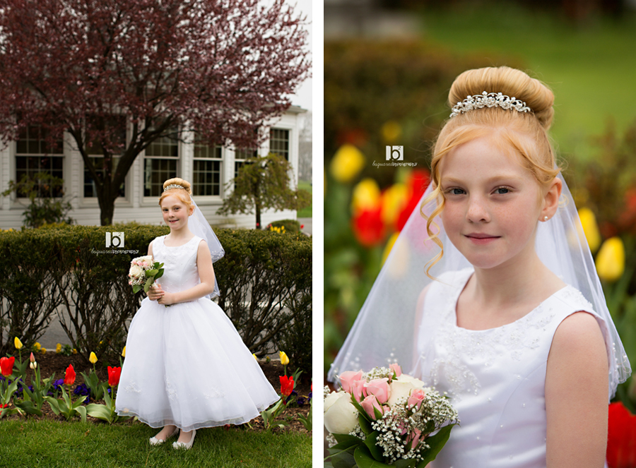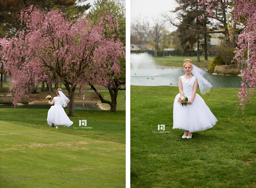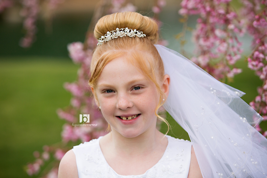 Another pretty communicant photographed at the Links. And although the earlier part of the day was gorgeous, about an hour before our session the clouds and fog rolled in and it dropped like 20 degrees. This is not been the year for good weather. But even a freezing little girl can put on a smile and brave the yuck weather for some pretty photos! At least the flowers were blooming.