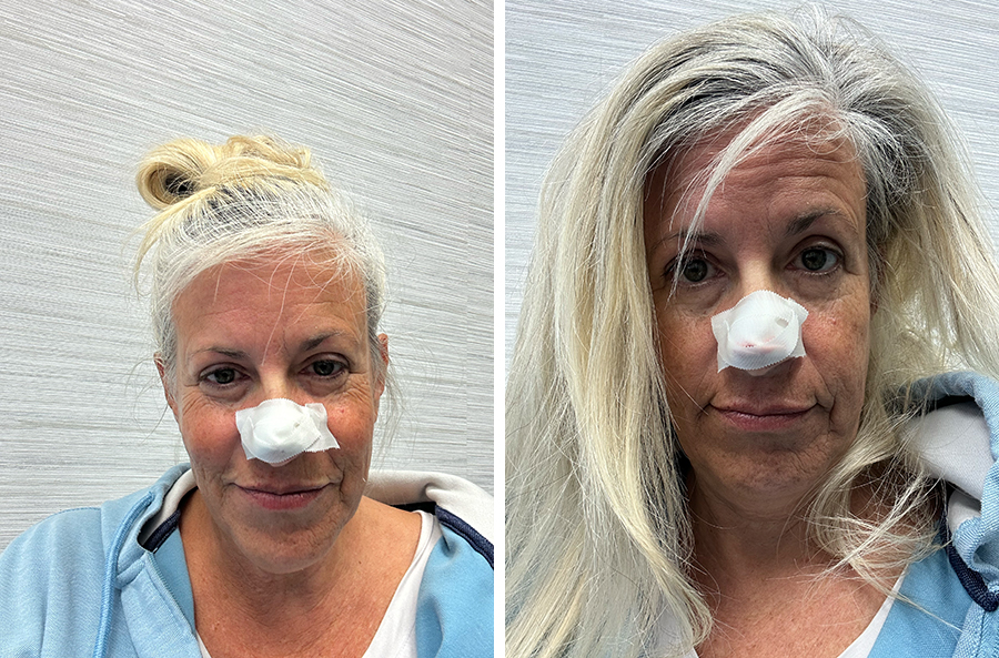I left the Mohs surgeon at the dermatologist and headed over to the plastic surgeon later that afternoon. He did a bilobed flap to move the skin around and cover the defect (the picture with the purple lines on my nose). The worst part was the novocaine shots in the nose (I asked the doctor if he would be offended with cursing and he said “let me see what you got”. I told him that was NOT the thing anyone should say to me and then at the first shot I said MOTHERFUCKER really loud. At least he laughed.) The part where he’s pulling the cut skin around and stretching it felt SO gross. The stitches were no party either.