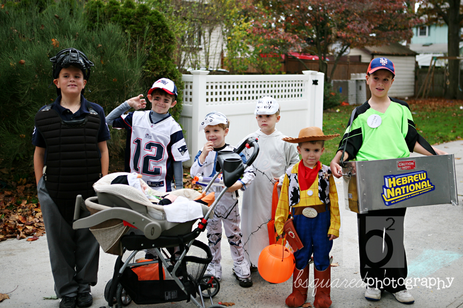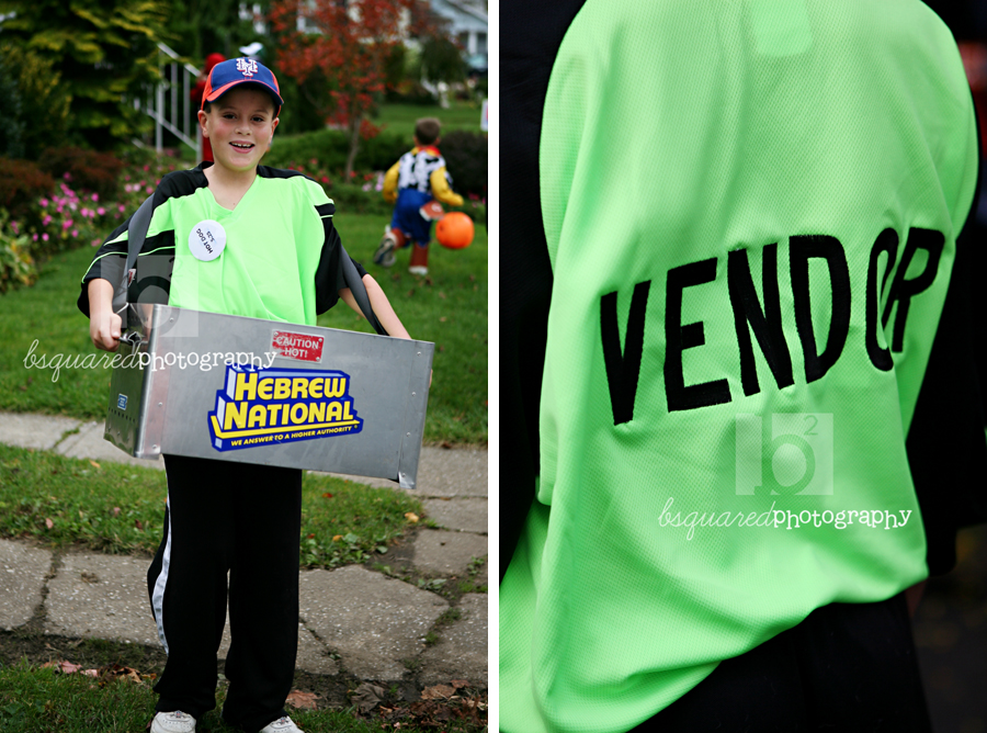 Patrick lugged that (easily 20lbs) Hebrew National HotDog carrier around for a long time (the whole parade route and most of trick or treating). A neighbor of my parents owns a CitiField concession and was so nice in letting Patrick borrow the hotdog carrier for the weekend. He also got him the shirt (to which Ronni added vendor on the back) and the pin to keep. Awesome. He got lots of compliments on the costume, even though he kept telling me he needs a chiropractor.